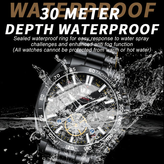 BINBOND տղամարդու շքեղ քվարցային ժամացույց՝ նրբագեղ սև, ջրակայուն՝ օրացույցով և լուսավոր սլաքներով, չժանգոտվող պողպատե ժապավենով, ամսաթվի ցուցադրմամբ, քրոնոգրաֆով և համաշխարհային ժամանակի հնարավորություններով՝ գործնական և ամենօրյա օգտագործման համար
