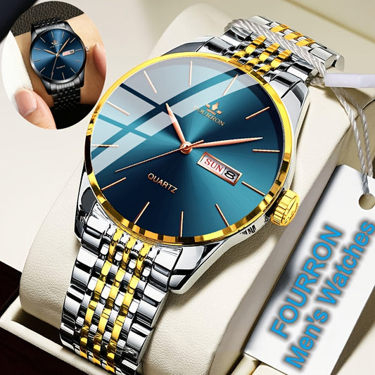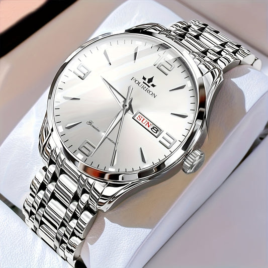 An Ideal Choice For A New FOURRON Brand Men's Luxury Stainless Steel Strap Simple Dial Quartz Watch With Date Calendar, Trendy Fashion Sports Casual Lifestyle Travel Multi-function Watch, Ideal For Friends' Birthdays, Holiday