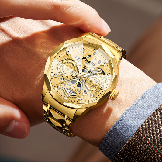 POSHI տղամարդկանց շքեղ ոսկեգույն քվարցե ժամացույց՝ արհեստական քարերով զարդարված, լուսարձակող ջրակայուն դիզայնով, օրացույցի գործառույթով և ոճային վեցանկյուն սլաքներով - կատարյալ գործնական նվեր տղամարդկանց համար, պաշտոնական ժամացույց