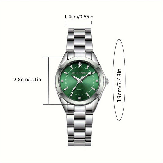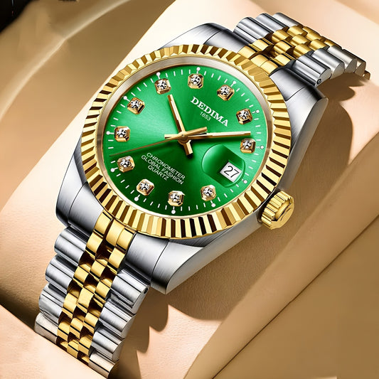 DEDIMA Elegant Stainless Steel Band Calendar Watch, Quartz Movement, Round Dial with Rhinestones, Battery-Powered, Non-Rechargeable Button Battery, Regular Cleaning, for Men, Women, Students, Christmas, Valentine'S Day, Thank