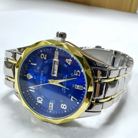 BANBONY Automatic Quartz Watch for Men & Women - Stainless Steel Strap, Blue & Golden HD Large Dial, IPX7 Waterproof, Rhinestone Accents, Date Calendar, Luminous Hands - Casual Fashion Unisex Watch for Birthday Holiday Gifts,