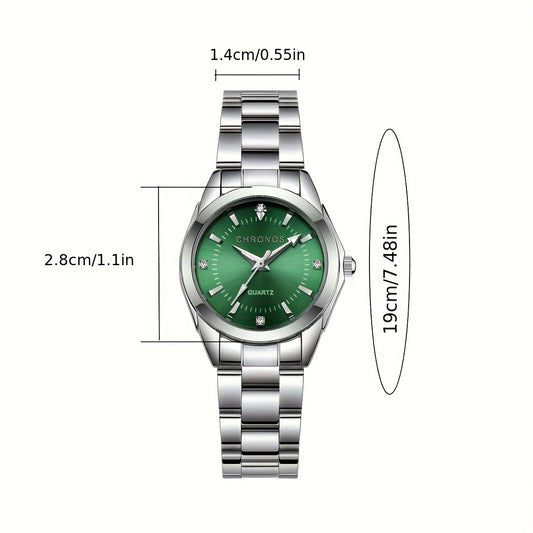 CHRONOS կանացի նորաձև, էլեգանտ դասական ժամացույց՝ չժանգոտվող պողպատե ժապավենով, հարմար է գործնական, առօրյա ուղևորությունների համար: Նուրբ և շքեղ ժամացույց ամենօրյա կրելու համար, կատարյալ է բացօթյա սպորտաձևերի, երեկույթների և որպես նվեր:
