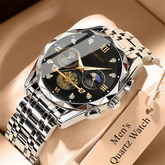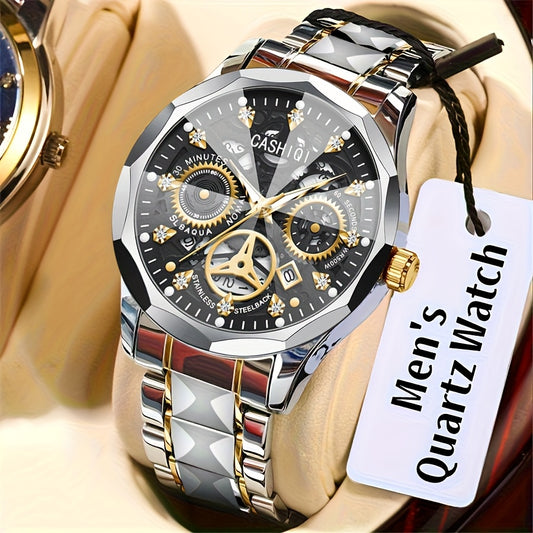 CASHIQI ապրանքանիշի տղամարդկանց պողպատե ժապավենով քվարցե ժամացույց՝ ռոմբաձև ցիֆերբլատով, փայլուն զարդարանքով, օրացույցով և լուսավորվող էկրանով, IPX7 ջրակայուն դատարկ քվարցե ժամացույց՝ բիզնեսի, ճանապարհորդության և ամենօրյա կրման համար - իդեալական նվեր:
