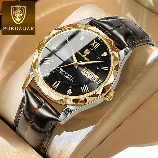 POEDAGAR տղամարդու նորաձև քվարցային ժամացույց, ջրակայուն 3ATM, կլոր համաձուլվածքից պատյան, լուսավոր սլաքներ, օրացույցի գործառույթ, մարտկոցով և էլեկտրոնային փոխանցմամբ, արհեստական կաշվից ժապավեն