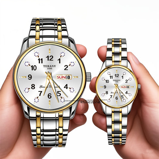 Two Stylish Digital Round Dial Couple'S Quartz Watches - IPX7 Waterproof, Luminous, Dual Calendar, Date and Day/Week Display, Alloy Strap Business Watches, Suitable for Women and Men, Valentine'S Day Gift Wristwatches