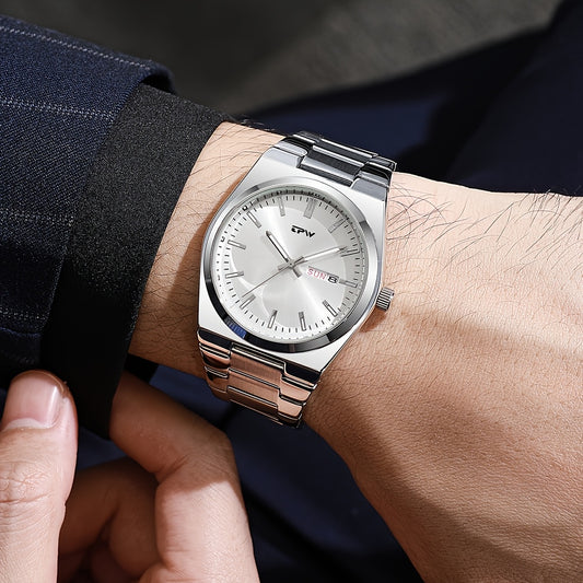 Նոր չժանգոտվող պողպատից տղամարդու քվարցային ժամացույց՝ օրացույցով և լուսային ֆունկցիայով, նորաձև ձեռքի ժամացույց, նվեր հարազատների և ընկերների ծննդյան կամ տոների համար, էլեկտրոնային մեխանիզմով ապրանքանիշ, լիովին ավտոմատ բիզնես