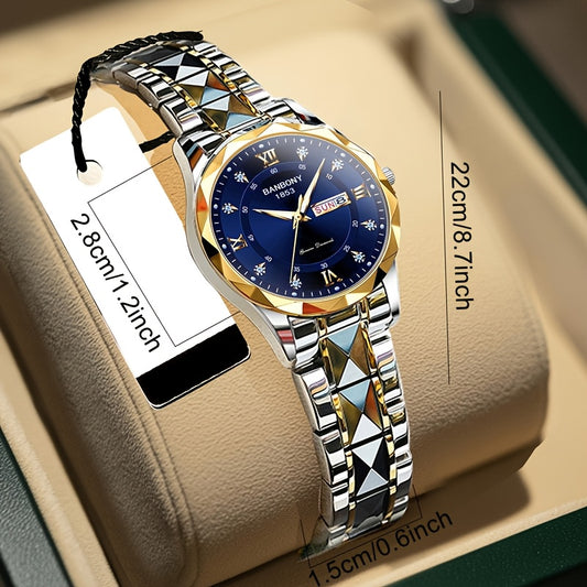 1 հատ Elegant BANBONY չժանգոտվող պողպատից կանացի ժամացույց՝ փայլուն քարերով, կրկնակի օրացույցով, մթության մեջ լուսավորվող էկրանով, ջրակայուն - իդեալական նվեր ծննդյան օրերի, տարեդարձերի և հատուկ առիթների համար, շքեղ աքսեսուար | Elegant