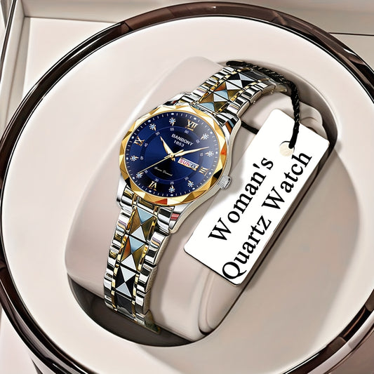 1pc BANBONY Women's Stainless Steel Quartz Watch with Rhinestone Accents, Scratch-Resistant Luminous Dial, IPX7 Waterproof, Week Calendar Display, Blue Dial & Golden-Tone Case - Luxury Casual Sports Watch for Birthdays, Holid