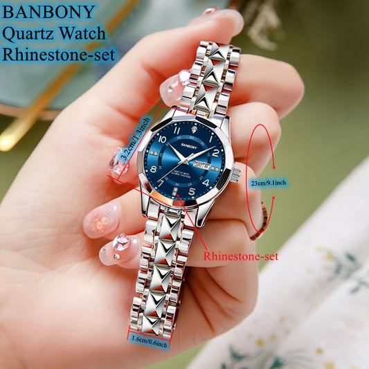 Banbony Women'S Quartz Watch - Luxury IPX7 Waterproof Stainless Steel Strap, Luminous Display, Rhinestone Accents, Date & Night Light, Minimalist Black Dial, Perfect Gift for Women, Casual Timepiece, Elegant Timepiece, Highqu