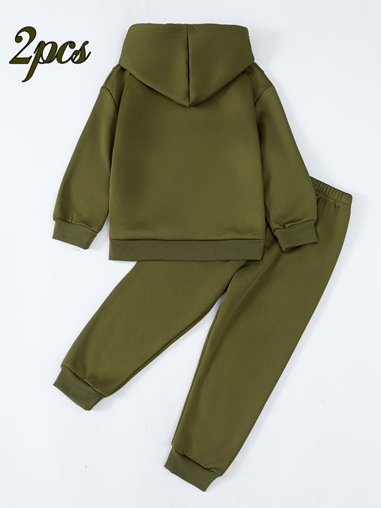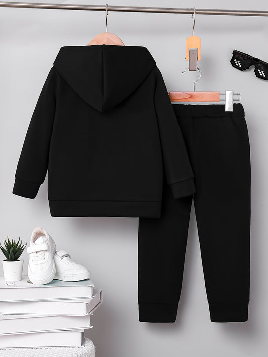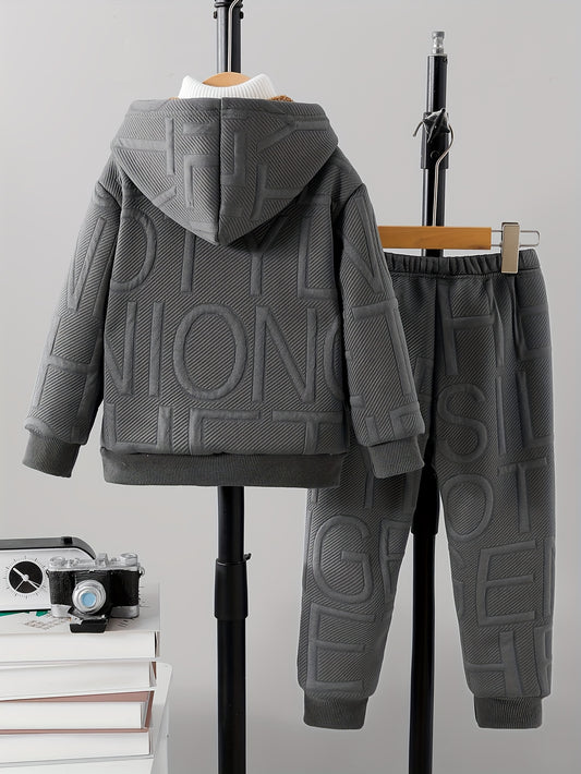 1 Set of 2pcs [Warm Fleece Jacket Set for Boys] Comfortable Fleece Jacket Boy Zip Hoodie And Pants Set | Letter Print, Long-Sleeved Casual Sportswear with Pockets, Perfect for Autumn And Winter Jogging And Outdoor Activities,