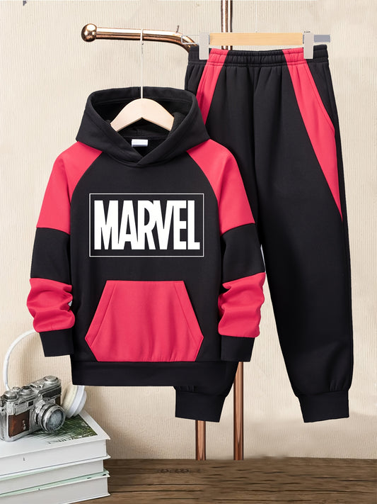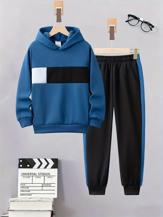 2pcs Boys' Autumn and Winter Fashion Color Block Design Hoodie and Pants Set, Warm and Comfortable Classic Sports Style Clothing for Outdoor Activities and Daily Wear, Polyester Micro-Elastic Durable Fabric, Best Choice for G