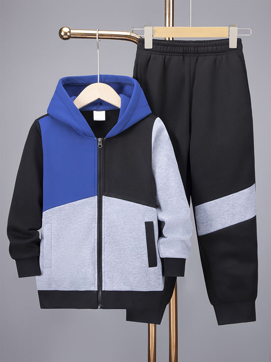 A Two-Piece Set for Boys Featuring a Casual Zip-Up Hoodie And Sweatpants, Designed with Trendy Color-Blocking for a Comfortable And Warm Autumn-Winter Sports Outfit, Perfect for Jogging And Everyday Wear, for Outdoor