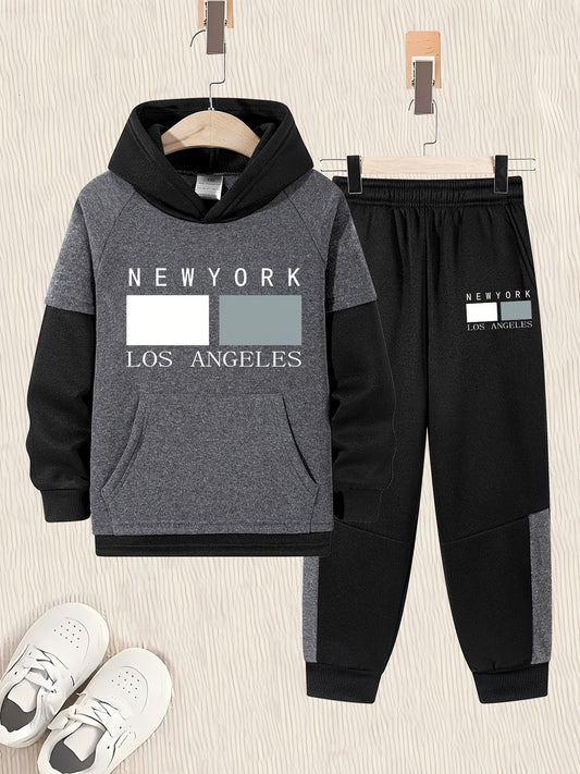 2pcs Boys' Casual Polyester Tracksuit Set, Los Angeles Alphabet Print, Medium Stretch Knit Fabric, Regular Fit, with Fleece-Lined Long Sleeve Hoodie and Joggers, for Daily & Outdoor Wear, Fall/Winter Warmth, for Outdoor