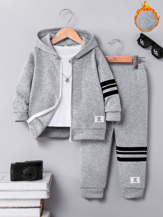 2pcs Boys' New Fashion Hooded Zip-Up Jacket and Pants Set, Black and White Striped Print Trendy Cool Style Outfit for Autumn/Winter, Thickened Sportswear with Pockets, Durable Polyester Fabric, Perfect Gift Choice for Kids, A