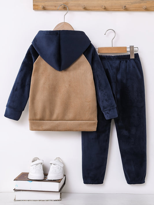 2pcs Boys' New Fashion Corduroy Fleece-Lined Hooded Zip-Up Jacket and Pants Set, Raglan Sleeve Color Block Design with Simple Patchwork, Stylish Thickened Sportswear for Outdoor Activities and Casual Attire, 100% Polyester St