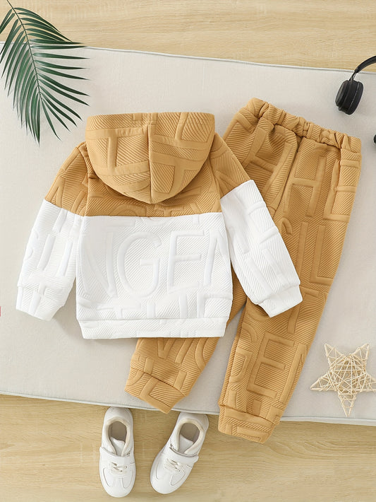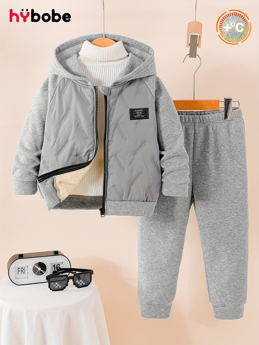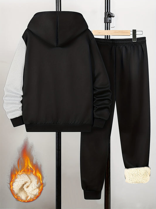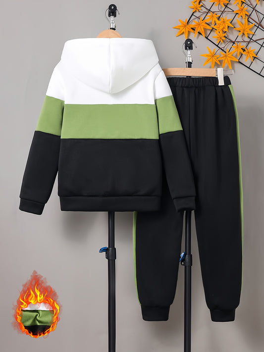 2pcs Boys' Winter Fleece-Lined Hooded Zip-Up Jackets with Elastic Waistband & Contrast Color Block Design - Casual Outdoor Wear for Autumn/Winter, Stylish Letter Pattern, Cozy Fleece Pants, Perfect for Outdoor, Thick