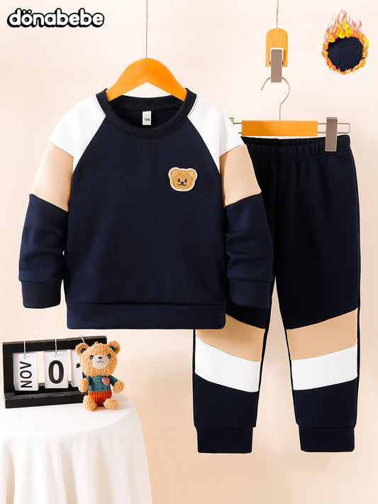 2pcs, Boys' Round Neck Sweatshirt Set, Suitable for Boys Aged 1-8, Fashionable Cartoon Bear Patch, Slightly Stretchy Fabric, Warm Fleece-Lined for Autumn and Winter, Ideal for Casual Sports Wear, Minimalist Style Perfect as a
