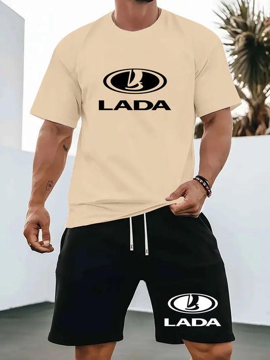 Տղամարդկանց ամառային առօրյա սպորտային երկու մասից բաղկացած հավաքածու՝ LADA տառերով նախշերով շապիկ և սև լարով շորտեր, առօրյա սպորտային հագուստ, սովորական չափս՝ իդեալական ամառային բացօթյա օգտագործման համար։
