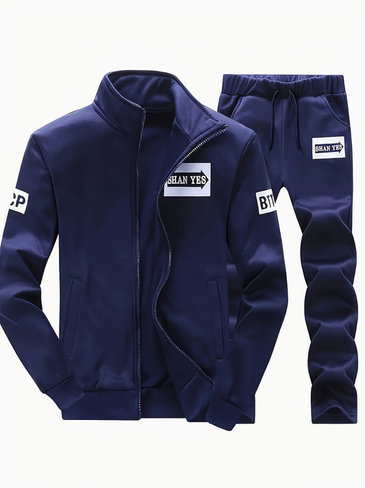 Տղամարդու մուգ կապույտ "Shan Yes" տպագրությամբ սպորտային հագուստ - ճարմանդով բաճկոն և գրպաններով մարզական տաբատ, ստանդարտ ֆիթ, գարնան և աշնան համար, հարմարավետ հանգստի հագուստ, հանգստի բաճկոն | սպորտային բաճկոն | ճարմանդով փակում, անհրաժեշտ բաճկոն