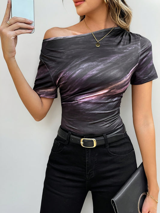 Կանացի էլեգանտ, թայ-դայ ասիմետրիկ դեկոլտեով կարճ թևքով շապիկ՝ մանուշակագույն-վարդագույն-կապույտ պարուրաձև նախշերով, շնչող, ձգվող գործվածքով, լվացքի մեքենայով լվացվող ամառային առօրյա վերնաշապիկով։