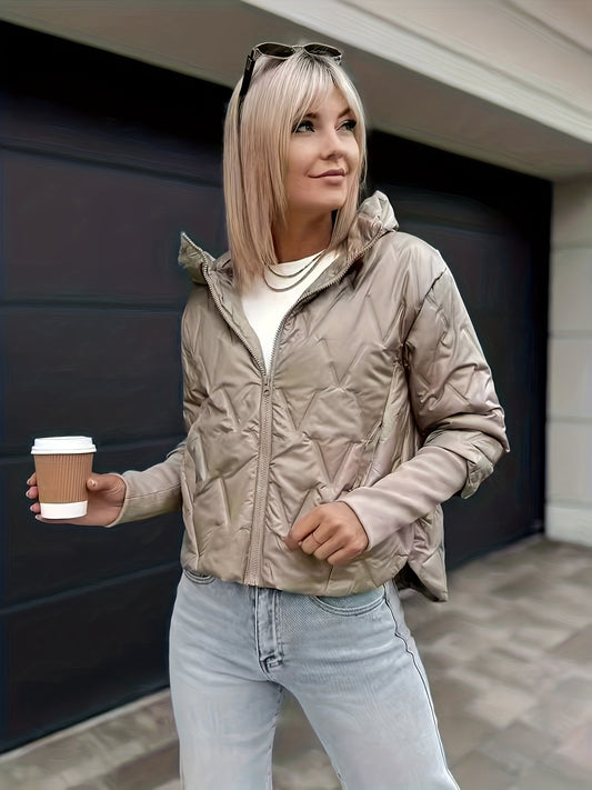 Women's Full-Zip Hooded Jacket - Beige Winter Coat with Full-Zip Front Closure, Machine Washable Long Sleeve Outerwear, Casual Warm Coat for Cold Weather, Windproof Blazer (No Belt/Hardware) - Versatile for Jeans & Dresses, J