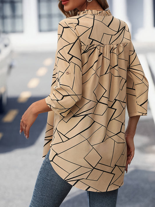 Geo Print V պարանոցով բլուզ, էլեգանտ ծալովի թևով վերնաշապիկ՝ գարնան և ամառի համար, կանացի հագուստ