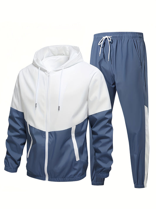 2pcs Men'S Casual Sportswear Set - Color Block Hooded Jacket and Pants, Polyester, Machine Washable, All-Season, with Pockets, Regular Fit, Spring Sportswear|Hooded Sportswear|Machine Washable Fabric