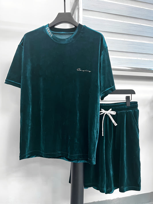 Men'S Fashion Velvet Knit Pullover Set, Contrast Letter Embroidery Top and Solid Color Drawstring Shorts, Simple Casual Outing Commuting Vacation Light Luxury Set, Regular Fit Elastic Knit Two-Piece Set, High-end Sheen Light