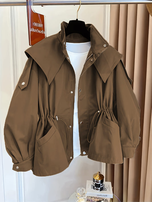 Կանացի միագույն պոլիեսթերային վերարկու՝ լարով գոտկատեղի, օձիքի և կրծքավանդակի գրպաններով - Գարնանային և աշնանային նորաձևություն, հարմարավետ, չձգվող գործվածք, ամենօրյա վերնազգեստ | Դասական երկար թևքեր | Չձգվող նյութ