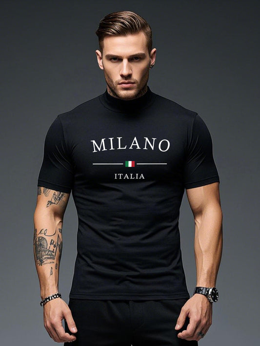 Տղամարդու Milano Italia տպագիր ամենօրյա շապիկ - կիսաօձիքով, կարճ թևքերով, թեթև գործվածքով, գարուն/ամառ հավաքածու, սև՝ սպիտակ լոգոտիպով, փափուկ և հարմարավետ՝ ամենօրյա հագուստի համար