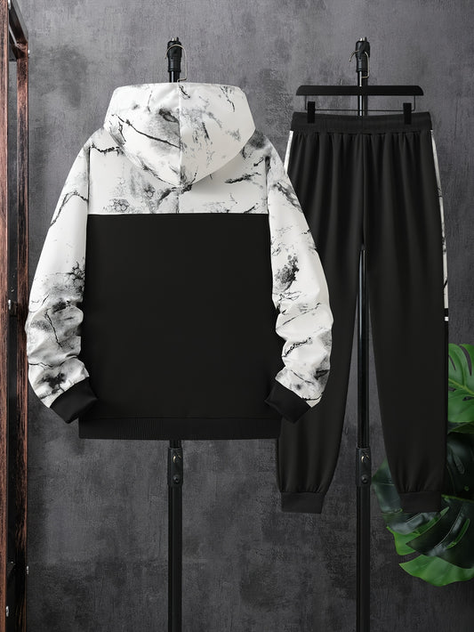 Youth 's Fashion Thickened Jacquard Fabric Grey White Navy Contrast Stitched Hoodie Sweatshirt + Comfortable Drawstring Casual Pants Two-Piece Set, Perfect for Outdoor Activities, Perfect for Outdoor