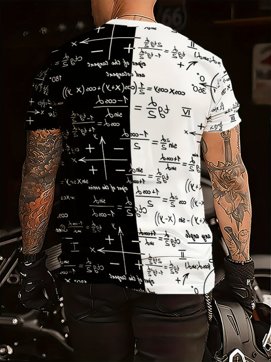 3D նորաձև կարճ թևքով շապիկ տղամարդկանց համար - սպիտակ՝ սև և ոսկեգույն մաթեմատիկական բանաձևերի տպագրությամբ, կլոր վզնոցով, սովորական չափսերով, բոլոր եղանակների հարմարավետություն