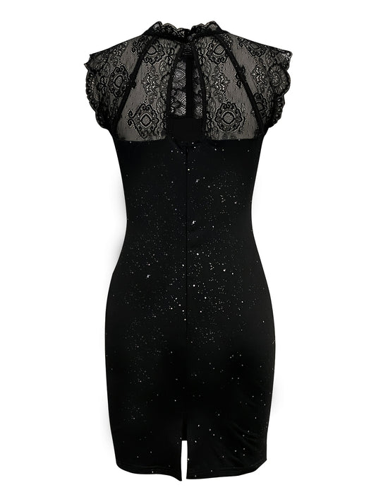 Կանացի սեքսուալ բոդիկոն զգեստ, բարձր պարանոցի ժանյակավոր դետալ, անթև սեկվին փայլ, միաձույլ գույն, տրիկոտաժե գործվածք, պոլիեսթեր 97%, սպանդեքս 3%, գարուն/ամառ հավաքածու, 230գ/մ²