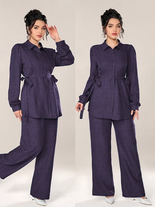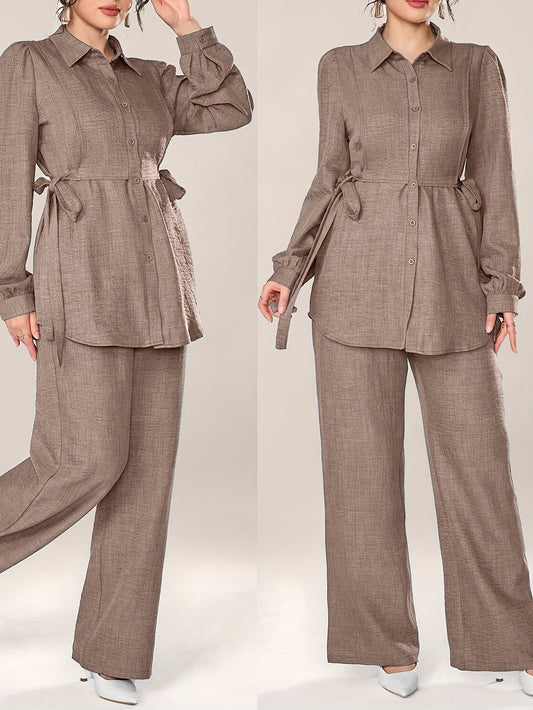 Կանացի ոճային երկկտոր հավաքածու - Էլեգանտ երկարաթև վերնաշապիկ՝ կապվող գոտկատեղով և լայն տաբատով, իդեալական է գրասենյակային հագուստի համար, գրասենյակային հագուստ | Էլեգանտ երկկտոր հավաքածու | Պոլիեսթերային գործվածք