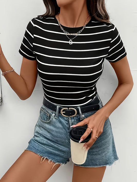 Կանացի նեղ, գծավոր, կարճ թևքերով մարզաշապիկ - սև և սպիտակ հորիզոնական շերտերով, կլոր վզով, շնչող ամառային առօրյա վերնաշապիկ, լվացքի մեքենայով լվացվող, ամենօրյա նորաձևություն, նրբագեղ առօրյա, որակյալ առօրյա հագուստ, հանգիստ հանդերձանք, դասական