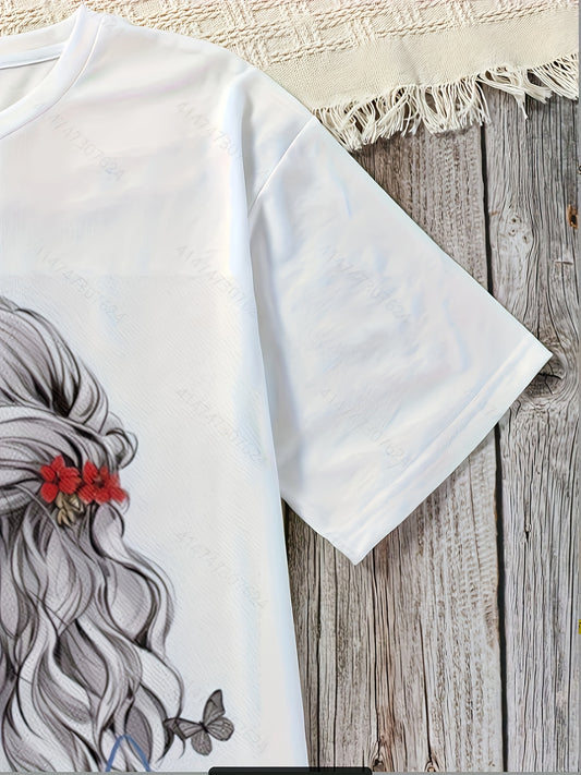 Կանացի ամառային առօրյա մարզաշապիկ վառ ծաղկային նախշերով, կարճ թևքերով կլոր վզով մարզաշապիկ, թեթև պոլիեսթերային գործվածք, սև տաբատ և աքսեսուարներ, թիթեռի նախշերով, թիթեռի վերնաշապիկ