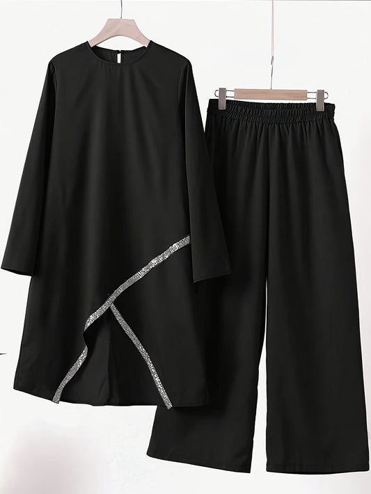 Երկու կտոր աբայայի հավաքածու լայն տաբատով, երկար թևքերով դիզայնով և մեջքի կապով, հարմար է գրասենյակի և առօրյա հագուստի համար, փափուկ և ձգվող գործվածք, էլեգանտ մերձավորարևելյան ոճով, հարմարավետ, լվացվող մեքենայով, գործնական և նորաձև