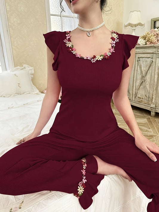 Կանացի էլեգանտ ծաղկային ասեղնագործված, գունագեղ փոքրիկ ծաղկային գլխարկով թևքերով վերնաշապիկ և ծալքավոր եզրով տաբատի հավաքածու