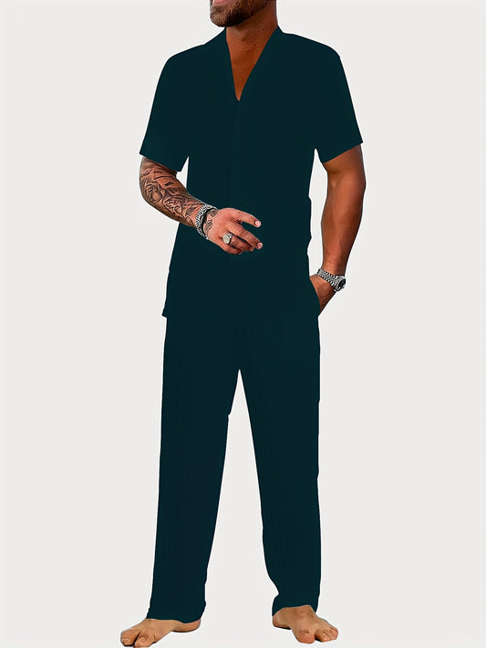 Տղամարդկանց ամառային հանդերձանք՝ միաձույլ գույնի կարճաթև կոճակով վերնաշապիկով, կանգառի օձիքով, կողային գրպաններով և սովորական շորտեր, կատարյալ տնային հագուստի համար: