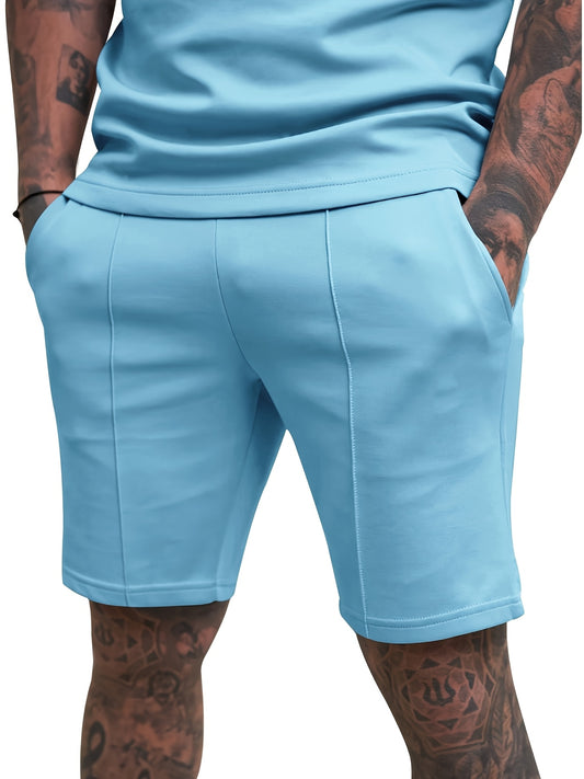 Տղամարդկանց ամենօրյա սպորտային հագուստի երեք նմուշների հավաքածու՝ արագ չորացող կարճաթև շապիկներ՝ կլոր վզով և առաձգական գոտկատեղով շորտեր, որոնք հարմար են գարնանը սպորտի և ֆիթնեսի համար: