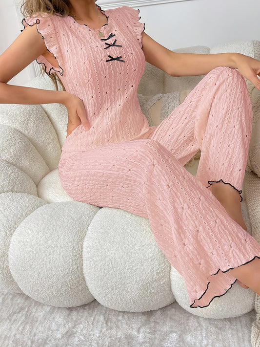 Elegant Women'S Lace Hollow Pajama Set with Contrast Trim and Bow Detail - Short Sleeve, Round Neck, Summer Sleepwear for Adults, Comfortable Polyester Blend, Perfect for Relaxing at Home, Summer Sleepwear | Contrast Trim Des