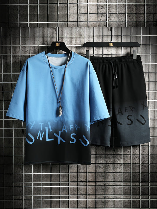 Տղամարդկանց ոճային ամառային հագուստի 2 մասից բաղկացած հավաքածու՝ գրադիենտային ոճով, տղամարդկանց կարճ թևքերով բամբակյա խառնուրդով մարզաշապիկ և լարով շորտերի հավաքածու