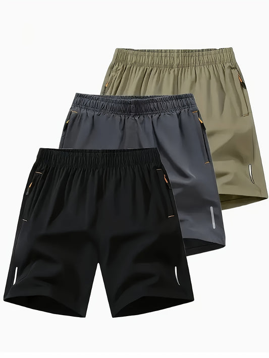 Տղամարդկանց նորաձև սպորտային պատահական շորտեր 3 փաթեթով, 97% պոլիեսթեր 3% էլաստան, պինդ գույն, կայծակաճարմանդ դետալ, հյուսված գործվածք, թեթև ձգվող, ազատ տեղավորվում է, 117 գ/մ² քաշ