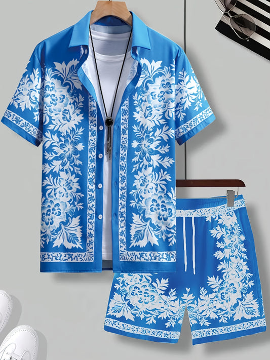 Տղամարդկանց երկու հավաքածու՝ ծաղկային նախշերով, կոճակներով և լարերով սպորտային շորտերով, երկու կտորից, հավայան լողափնյա սպորտային ոճով