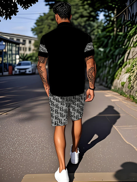Men'S Fashion Velvet Knit Pullover Set, Contrast Letter Embroidery Top and Solid Color Drawstring Shorts, Simple Casual Outing Commuting Vacation Light Luxury Set, Regular Fit Elastic Knit Two-Piece Set, High-end Sheen Light