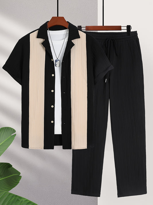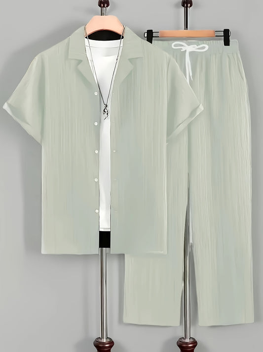 Տղամարդկանց առօրյա ամառային հավաքածու 2 հատ. կարճաթև կոճակով վերնաշապիկ կուբայական օձիքով և գոտկատեղով շալվար, պոլիեսթեր խառնուրդ, միաձույլ գույն, սովորական, շնչող գործվածք, թեթև ամենօրյա հագուստի համար