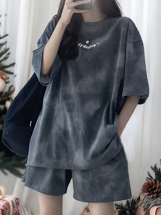 Letter Print Hong Kong Style Հարմարավետ պատահական ազատ կարճաթև շորտեր, ամառային կանացի նորաձև բազմակողմանի նիհարեցնող պատահական վազքի սպորտային կոստյում Երկու կտոր զույգերի հավաքածու, մեծ չափսի կանացի ամենօրյա սպորտային կոստյում