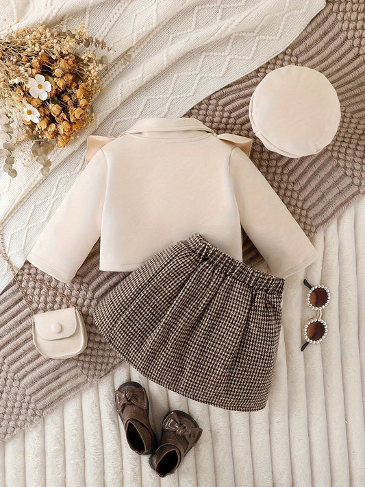 Վինտաժ աղջիկների հավաքածու, երկարաթև վերնաշապիկ շրմփոց + տուփ ծալքավոր վանդակավոր կիսաշրջազգեստ + համընկնող բերետ, ձմեռային/աշուն հագուստ, ամենօրյա բացօթյա, երեկույթ, նվեր