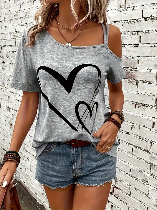 Heart Print Սառը ուսերով վերնաշապիկ, պատահական կարճաթև անթև ասիմետրիկ վերնաշապիկ, կանացի հագուստ
