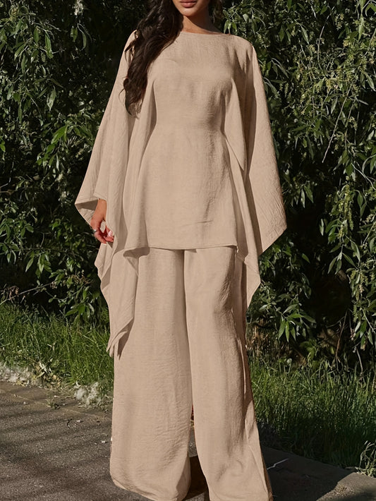 Կանացի միագույն, V-աձև դեկոլտեով կարճ թևքերով վերնաշապիկ՝ առաձգական գոտկատեղով, լայն տաբատով, երկկտոր հավաքածու
